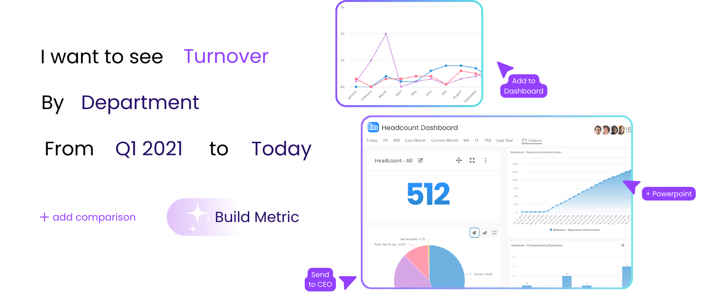 Because metrics are already calculated (turnover, headcount, DEI, tenure, etc.), HRIS analysts stop rebuilding logic or troubleshooting broken BI formulas.
